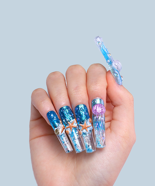 Ocean Whisper - Ocean Blue Long Coffin Press-Ons with Jellyfish & Starfish Charms