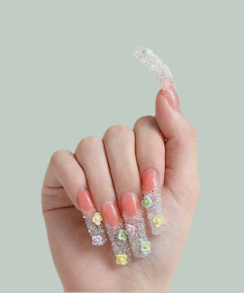 Blossom Gradient – Pink & Purple Long Duck Press-Ons with Crystal & Floral Accents