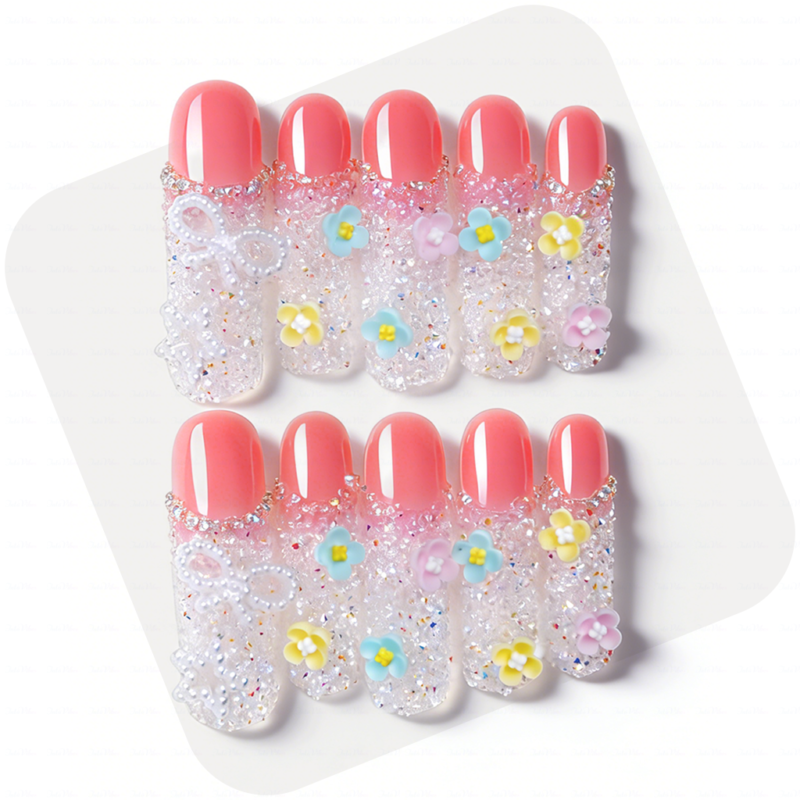 Pink Diamond French - Long Duck Press-Ons with Crystal Floral Accents