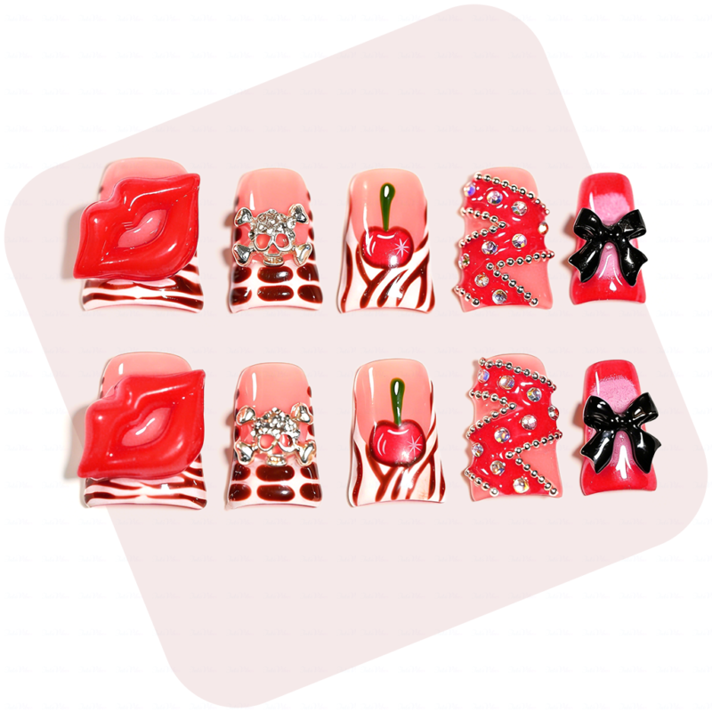 Cherry Kiss - Short Duck Press-Ons with 3D Lip & Cherry Accents