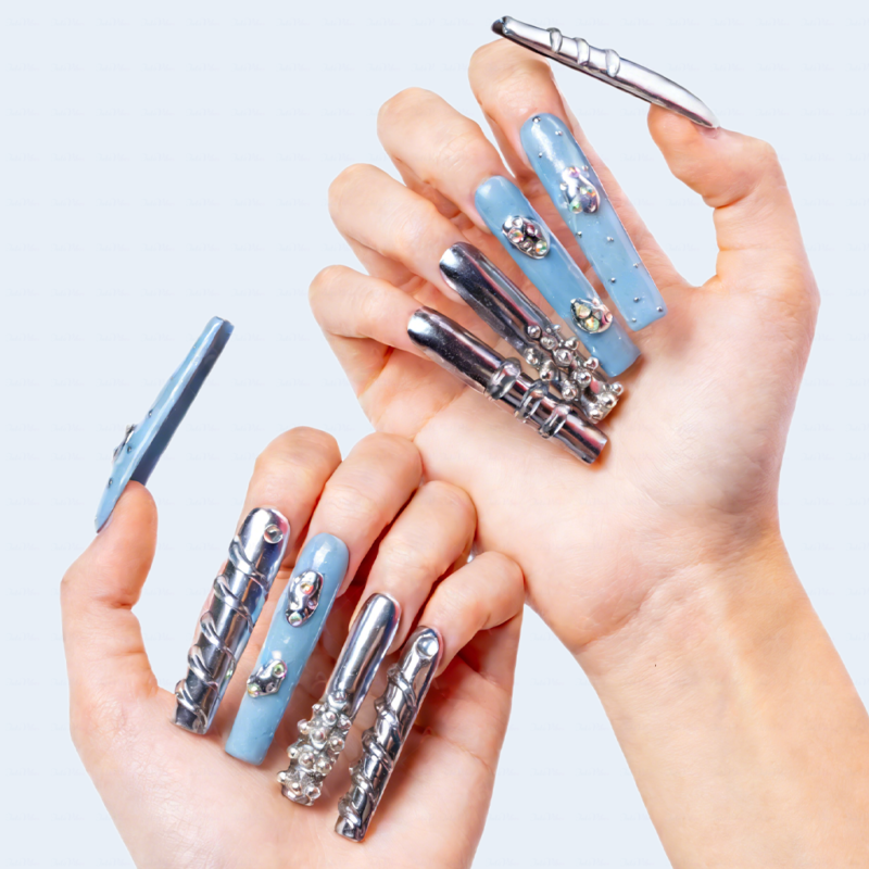 Chrome Frost – Slate Blue & Silver Long Square Press-Ons with Crystal Accents