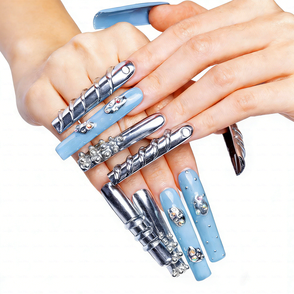 Matte slate blue & glossy silver long square press-ons with 3D chrome textures, crystal gems, and a sleek finish—100% handmade and paired with ultra-strong adhesive for a secure, salon-like hold.