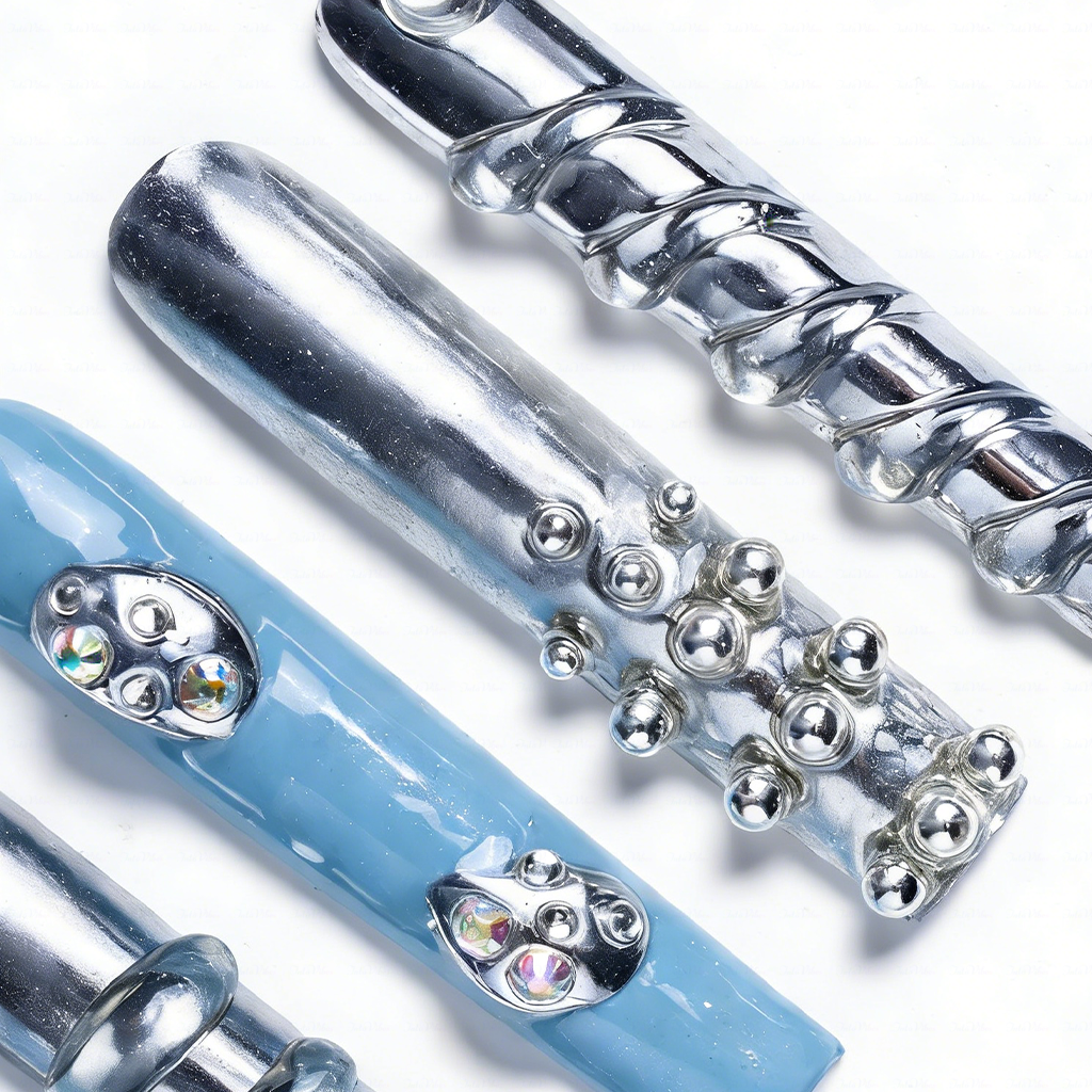 - 3D chrome & crystal accents: metallic textures and gems that stand out dramatically
