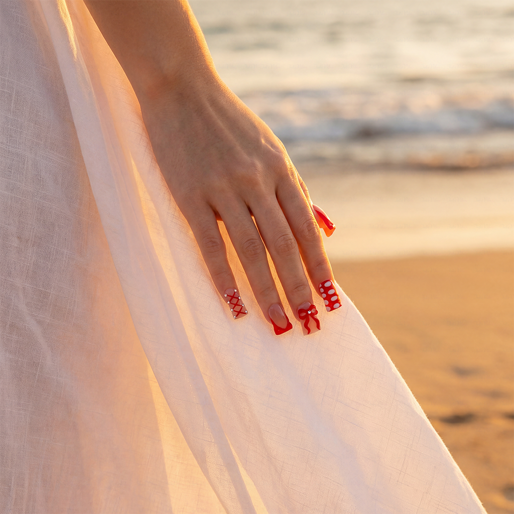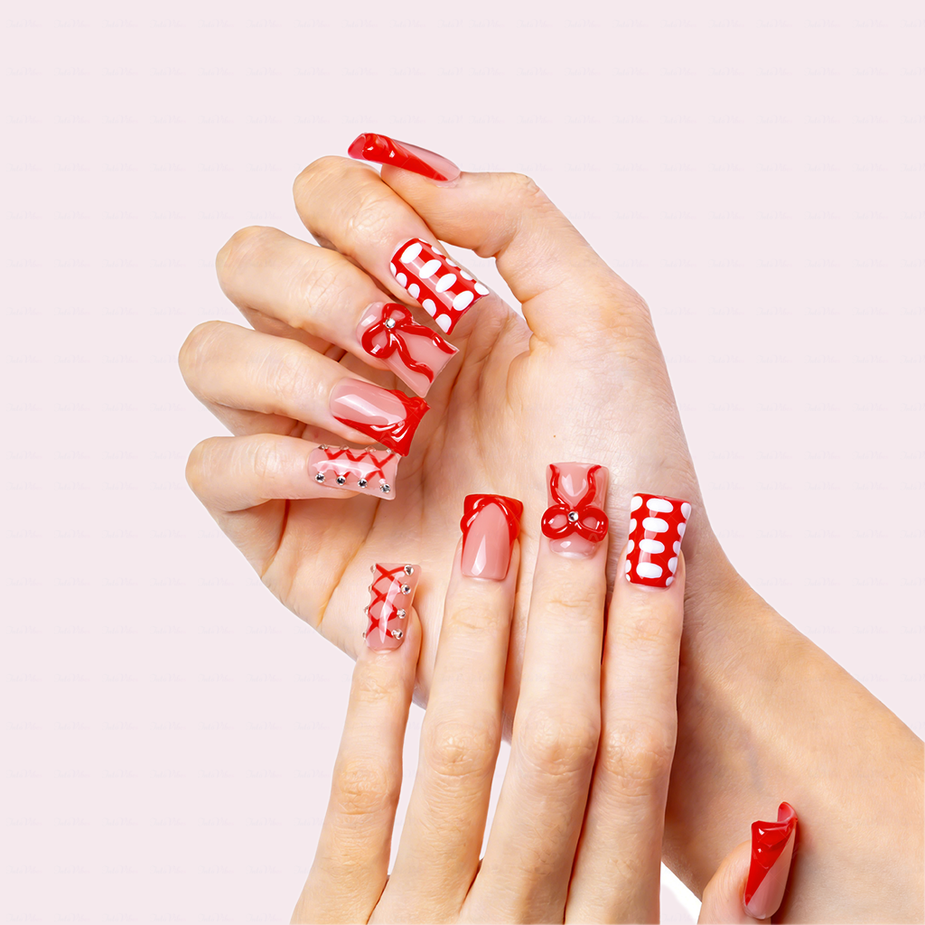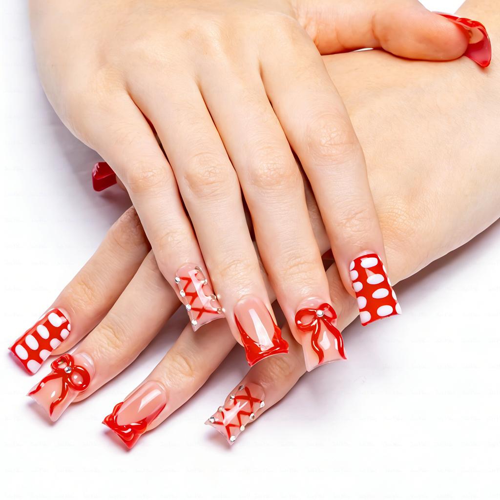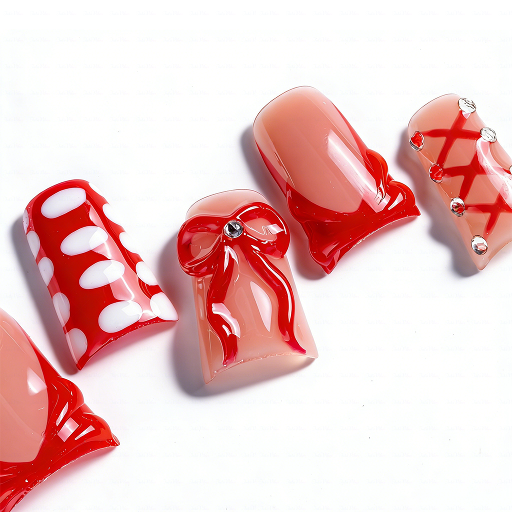 Glossy nude & vibrant red short duck press-ons with 3D bow details, polka dot patterns, and lace-inspired texture—100% handmade and paired with ultra-strong adhesive for a secure, salon-like hold.