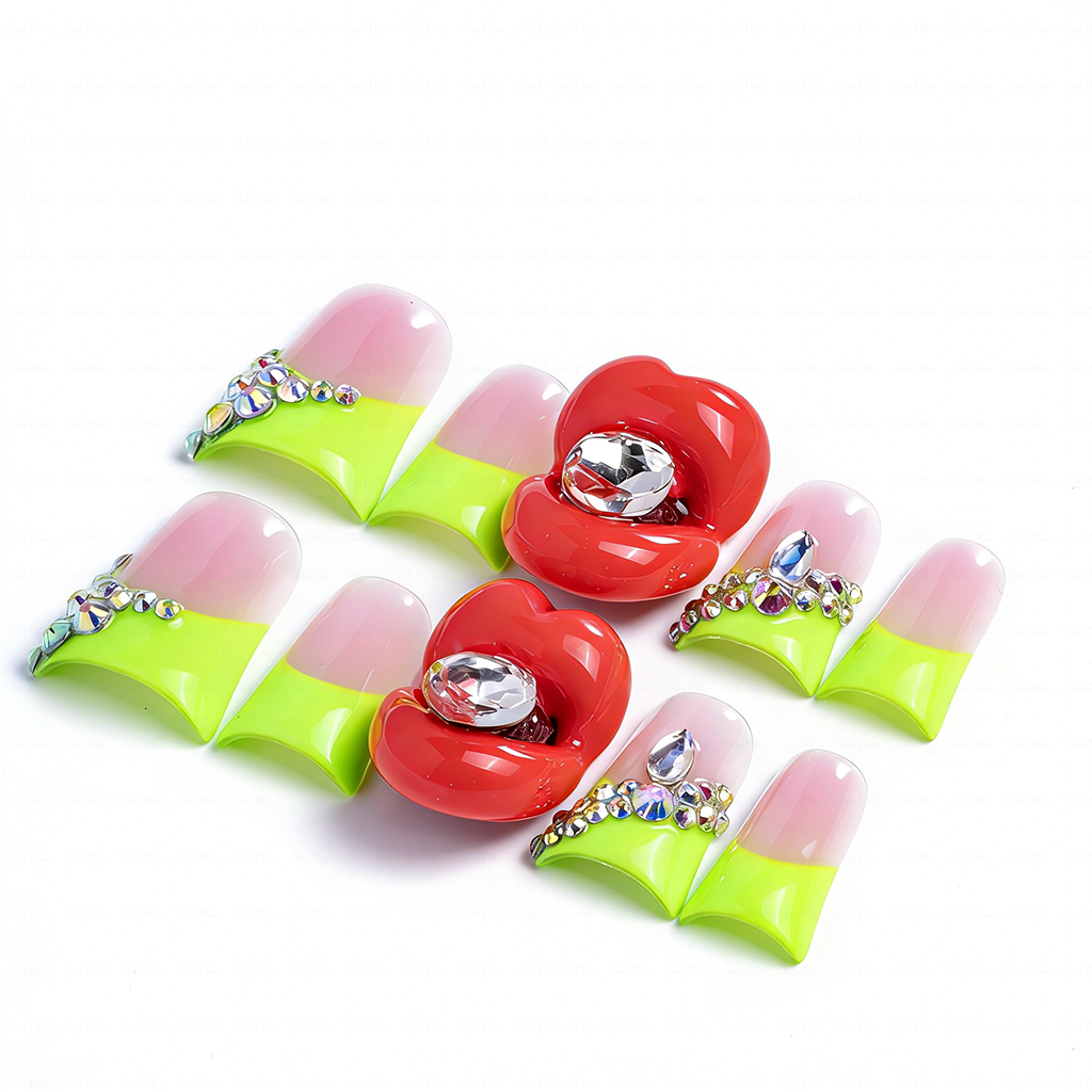 Glossy blush-pink & neon-green short duck press-ons with 3D pouty lip texture, sparkling rhinestone clusters, and bold color-block details—100% handmade and paired with ultra-strong adhesive for a secure, salon-like hold.
