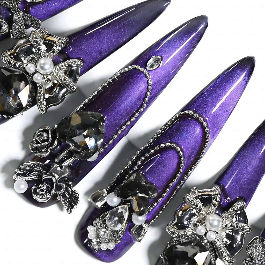 Luxurious satin-purple stiletto press-ons with dark crystal accents, 3D chain textures, and gothic metal details—100% handmade and paired with ultra-strong adhesive for a secure, salon-like hold.