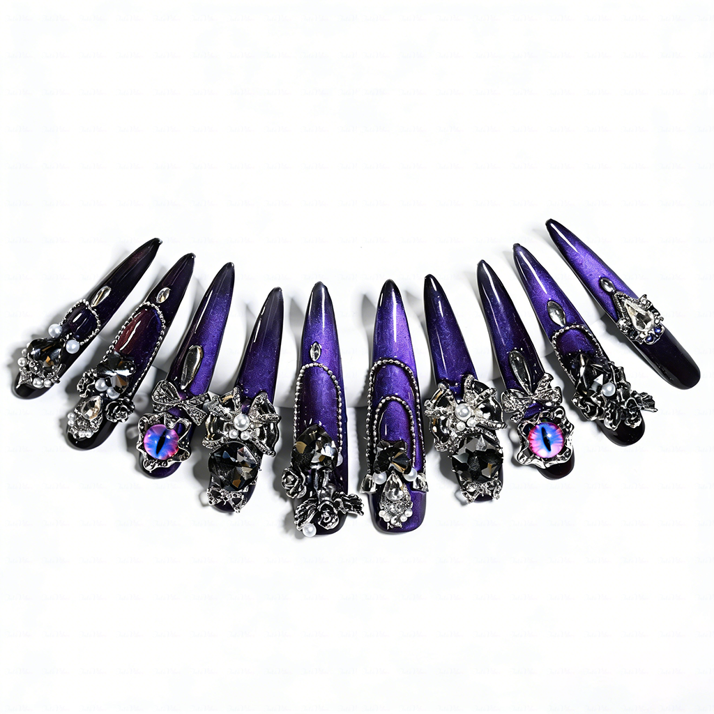 Noir Amethyst-Satin Purple Stiletto Press-Ons with Dark Crystal & Chain Charms