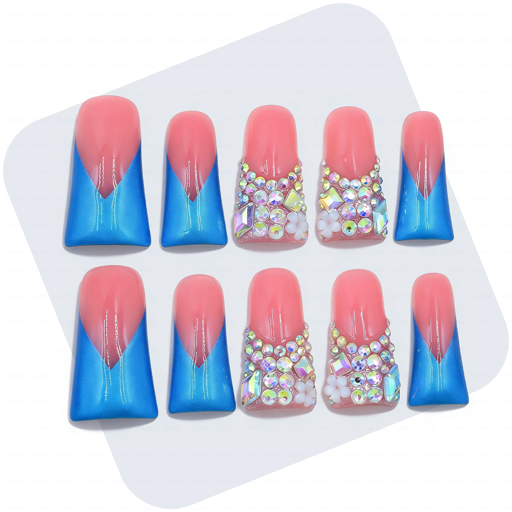 Vibrant pink & blue long duck press-ons with gradient tips, 3D crystal clusters, and delicate floral details—100% handmade and paired with ultra-strong adhesive for a secure, salon-like hold.