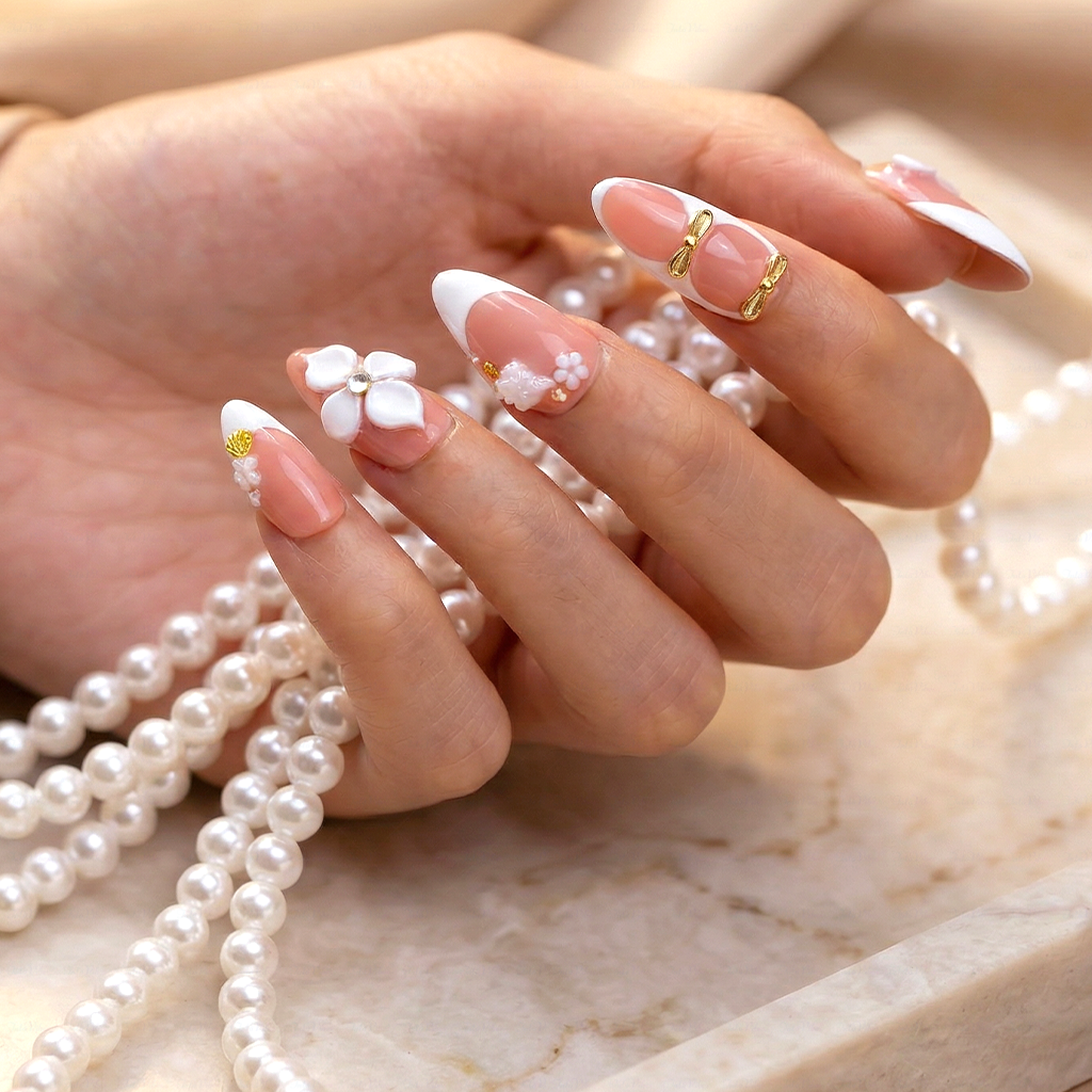 Glossy soft-peach Length Almond press-ons with creamy French tips, sculpted 3D flower accents, delicate gold bow details, and subtle rhinestone sparkle -100% handmade and paired with ultra-strong adhesive for a secure, salon-like hold.