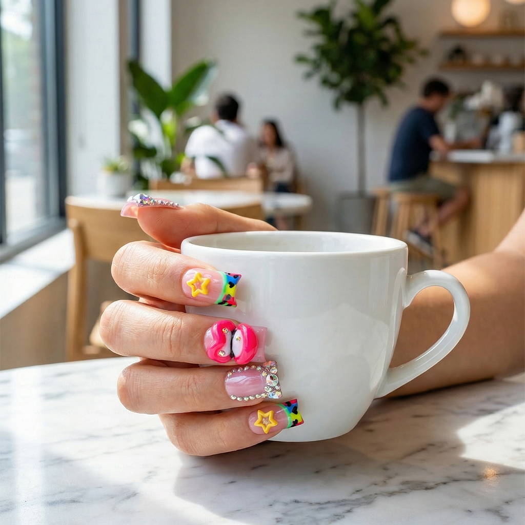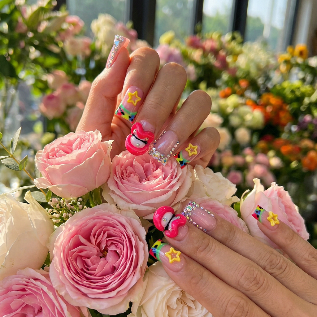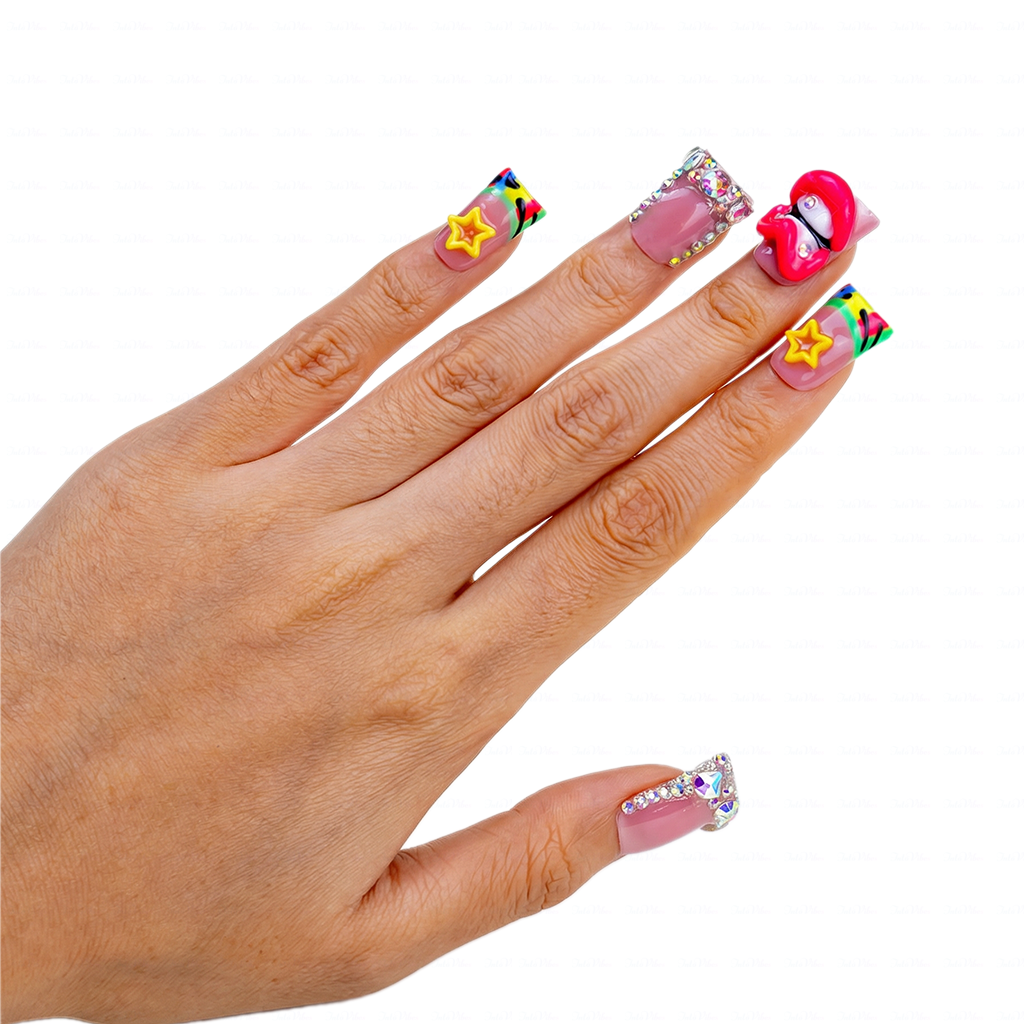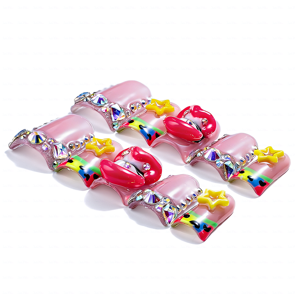 Glossy bubblegum-pink short duck press-ons with 3D pouty lip texture, iridescent rhinestone accents, and playful yellow star + neon rainbow details—100% handmade and paired with ultra-strong adhesive for a secure, salon-like hold.
