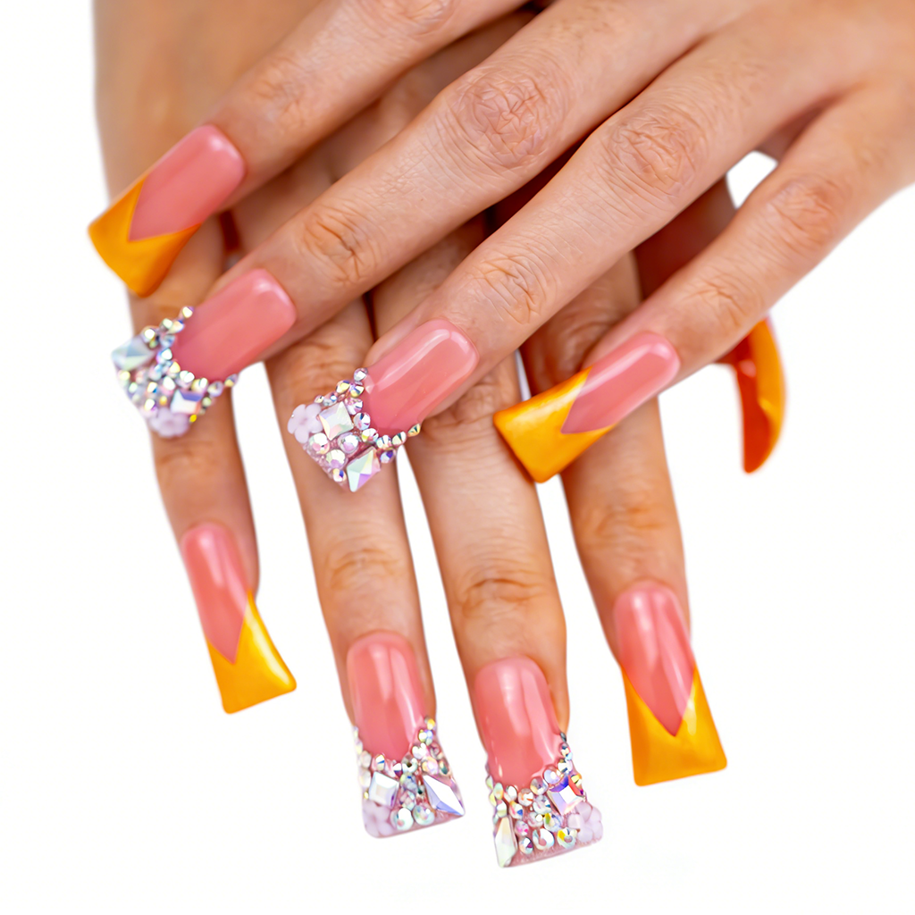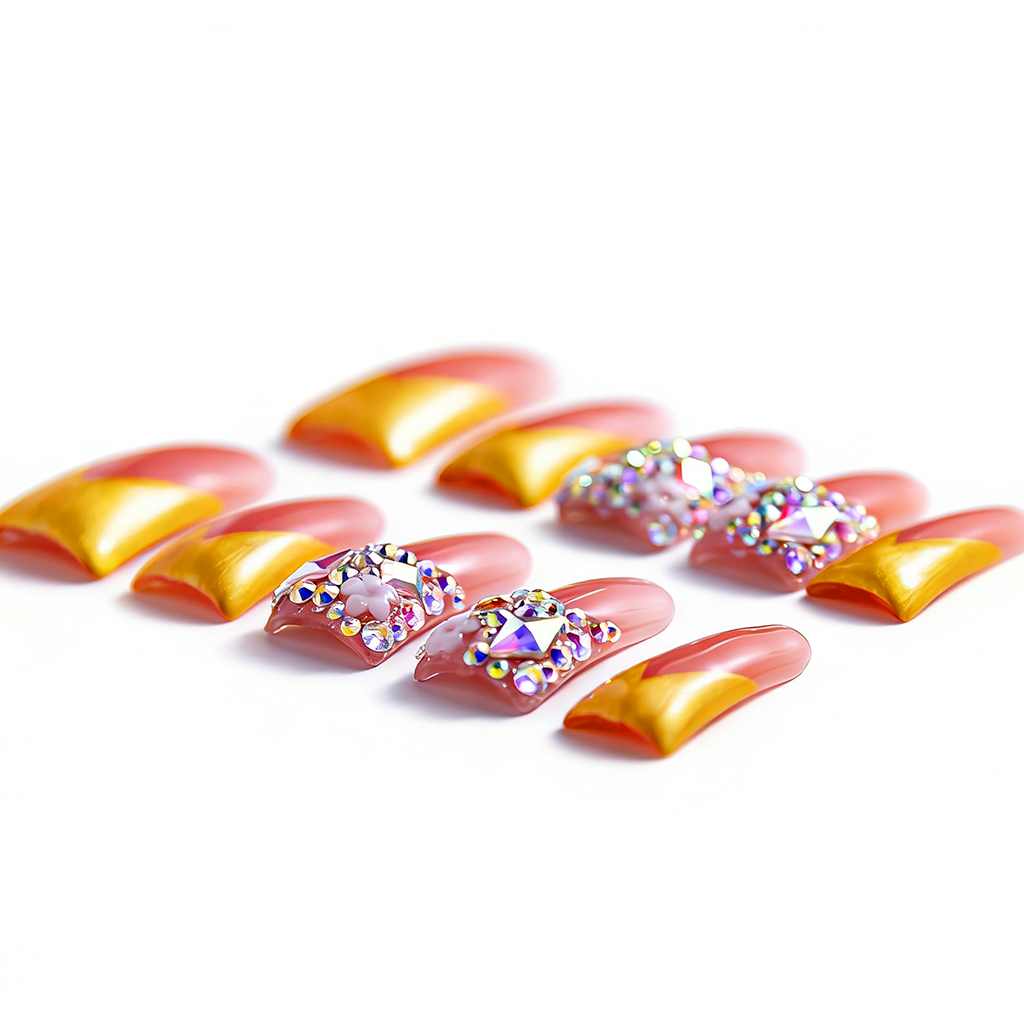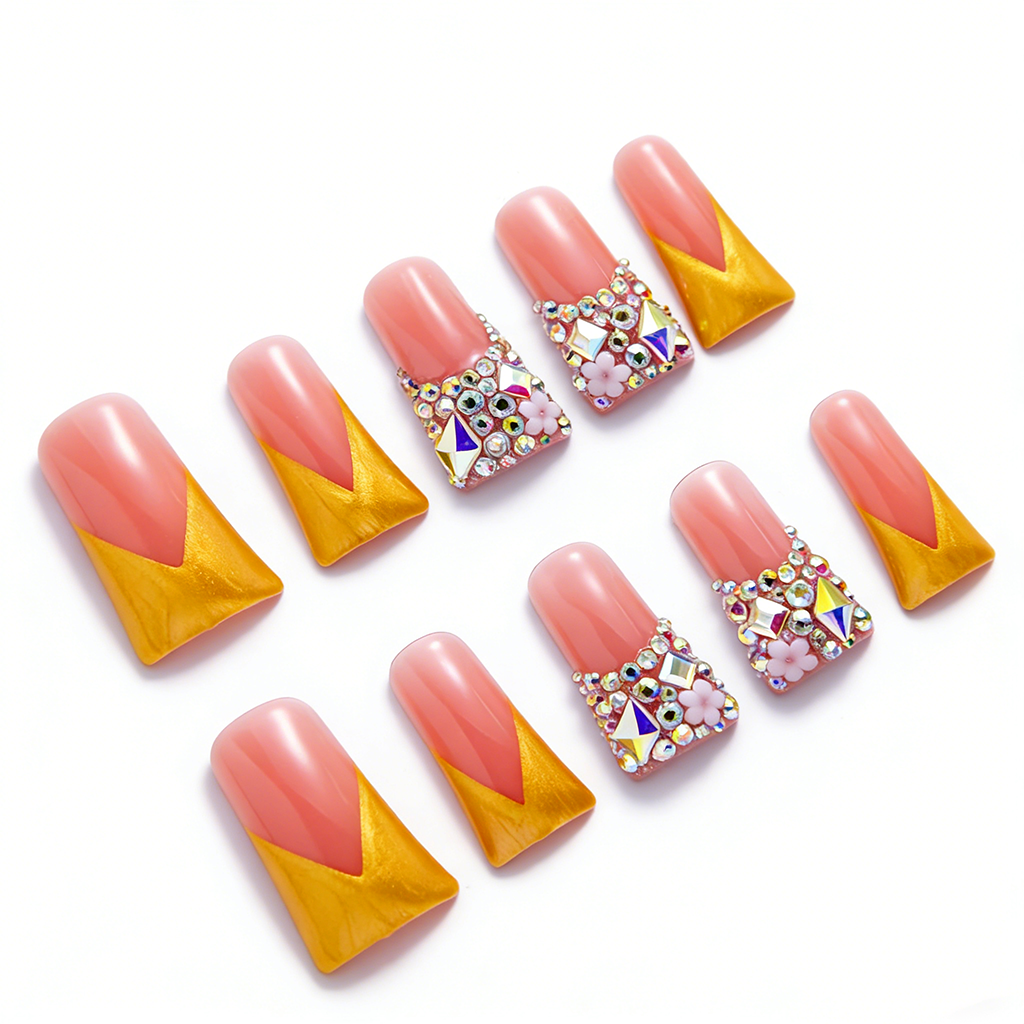 Sunset Blossom – Pink & Gold Long Duck Press-Ons with Crystal & Floral Accents