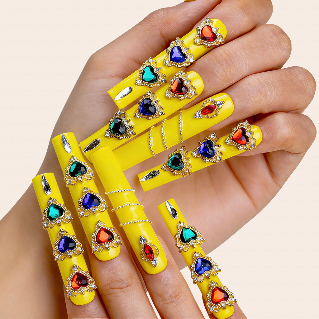 High-gloss neon yellow long square press-ons with 3D rainbow crystal hearts, gold trim, and delicate silver chains—100% handmade and paired with ultra-strong adhesive for a secure, salon-like hold.