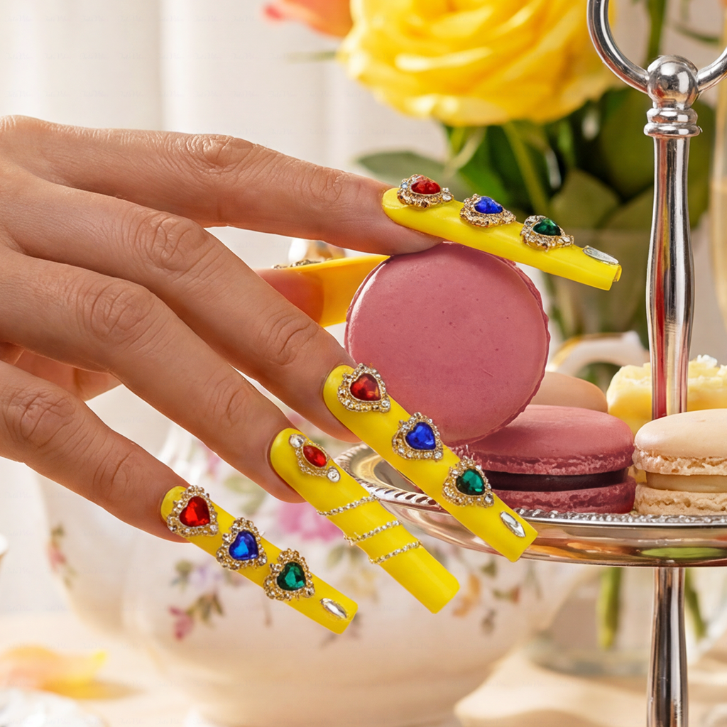 Sunset Heart-Neon Yellow Long Square Press-Ons with Rainbow Crystal Hearts