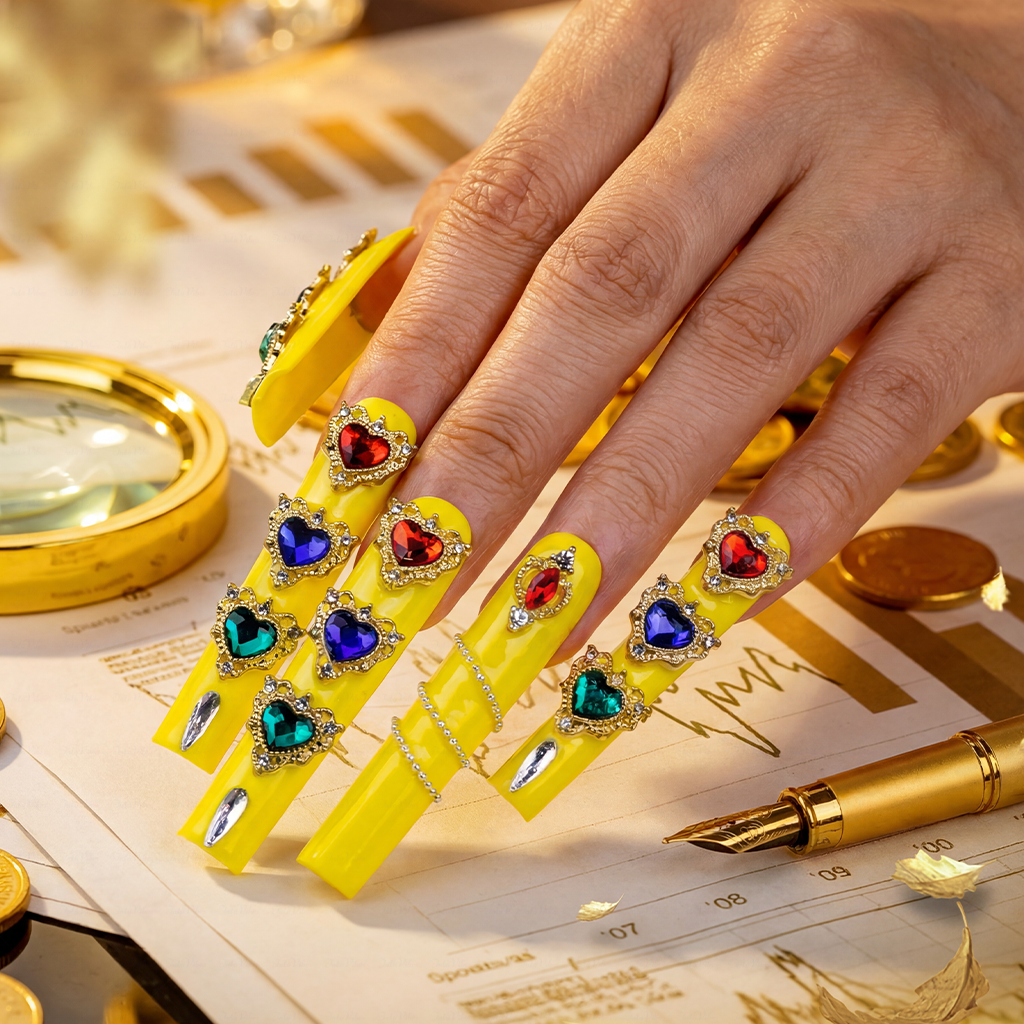- Playful bold favorite: neon yellow + rainbow crystals for “vibrant & eye-catching” energy