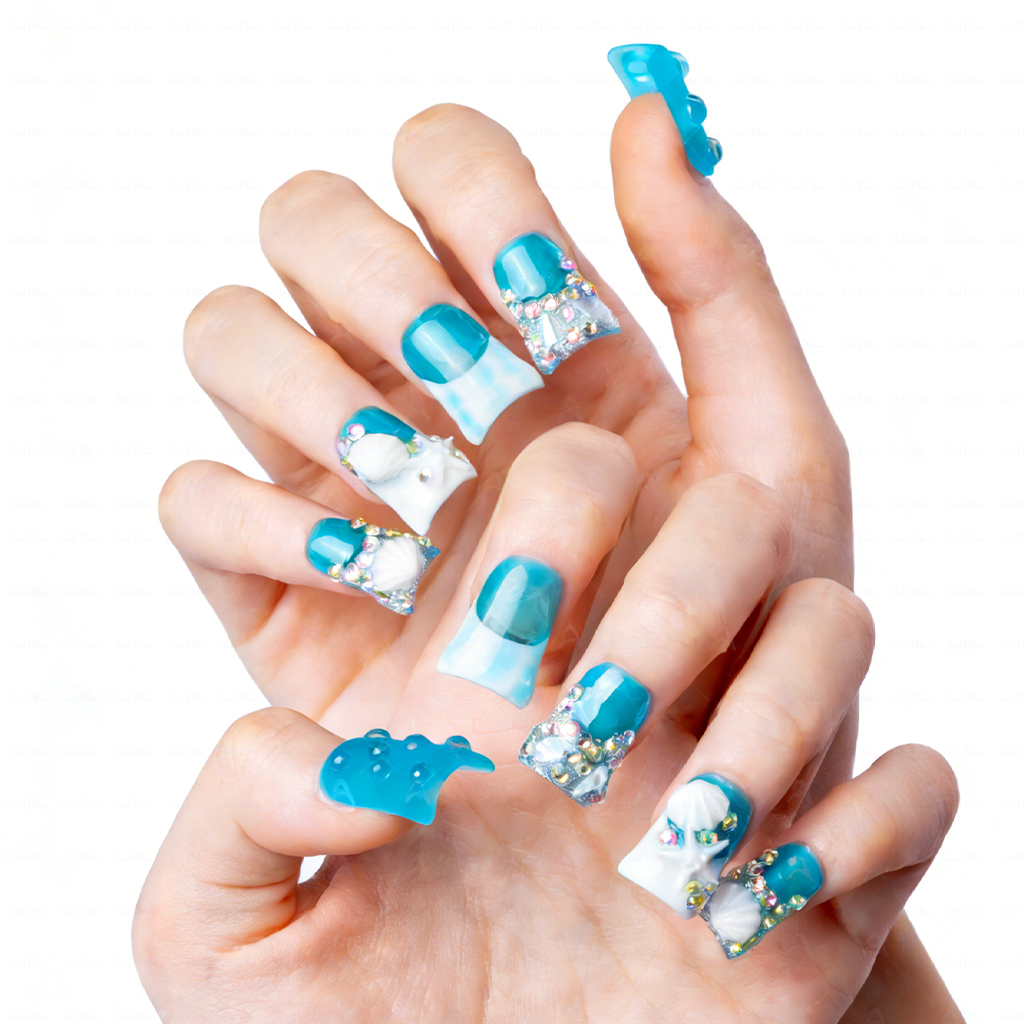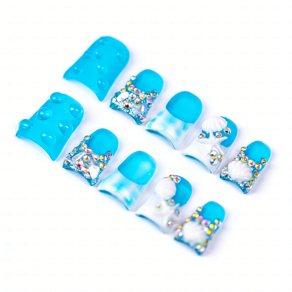 Tide Sparkle-Ocean Blue Short Duck Press-Ons with Starfish & Seashell Charms